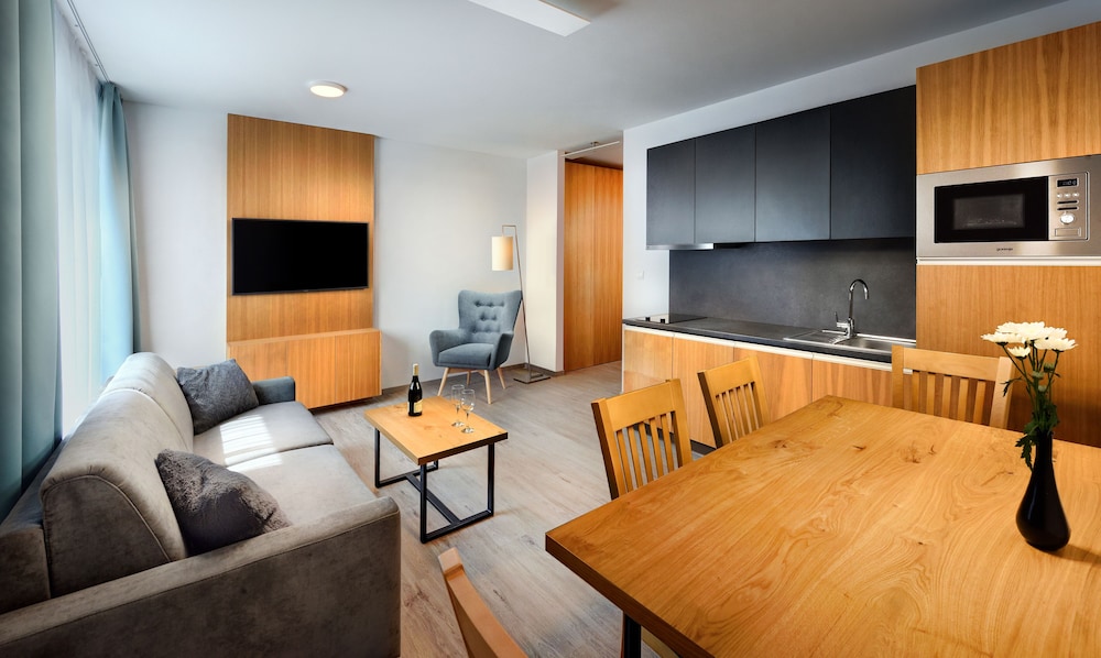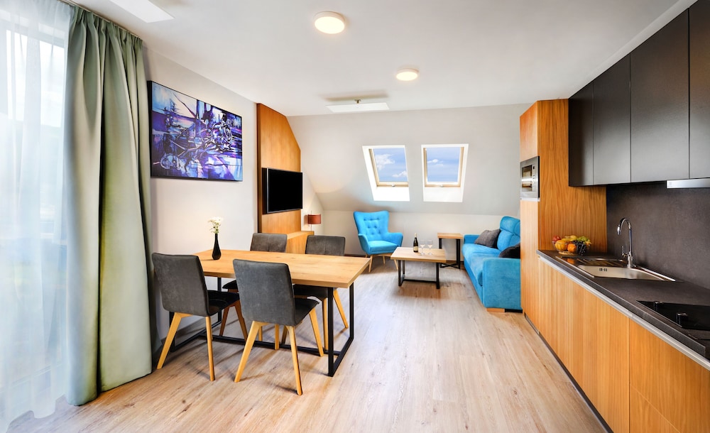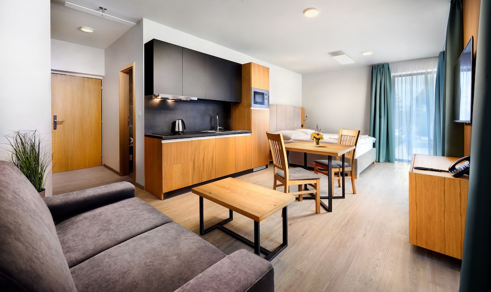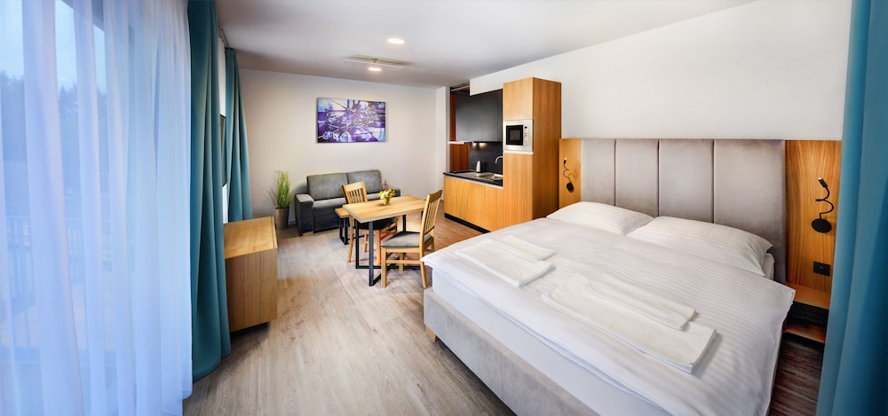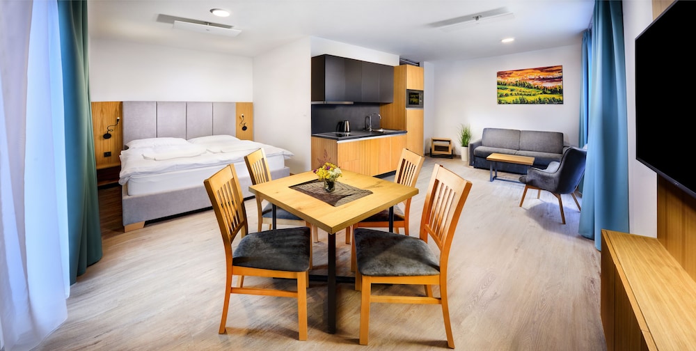 Maladinovo in Liptovsky Mikulas liegt im Unterhaltungsviertel, nur 5 Gehminuten von Liptovský Mara und Aquapark Tatralandia entfernt. Dieses Aparthotel mit Wellnessangebot ist 0,7 km von Fallschirmsprungzentrum Hurricane Factory Tatralandia und 4,5 km von Námestie Osloboditeľov entfernt. Fühl dich in einem der 92 Zimmer, die Küchen bieten, die über Kühlschränke und Herdplatte verfügen, wie zu Hause. Die Zimmer sind mit Select-Comfort-Betten ausgestattet. 55 Zoll groáe LCD-Fernseher mit Digitalempfang sorgen fr gute Unterhaltung; auáerdem steht ein WLAN-Internetzugang (kostenlos) zur Verfgung. Zur Austattung gehören Schreibtische und Mikrowellen; die Zimmer werden auf Anfrage sauber gemacht. Entfernungen werden bis auf 0,1 Kilometer gerundet.