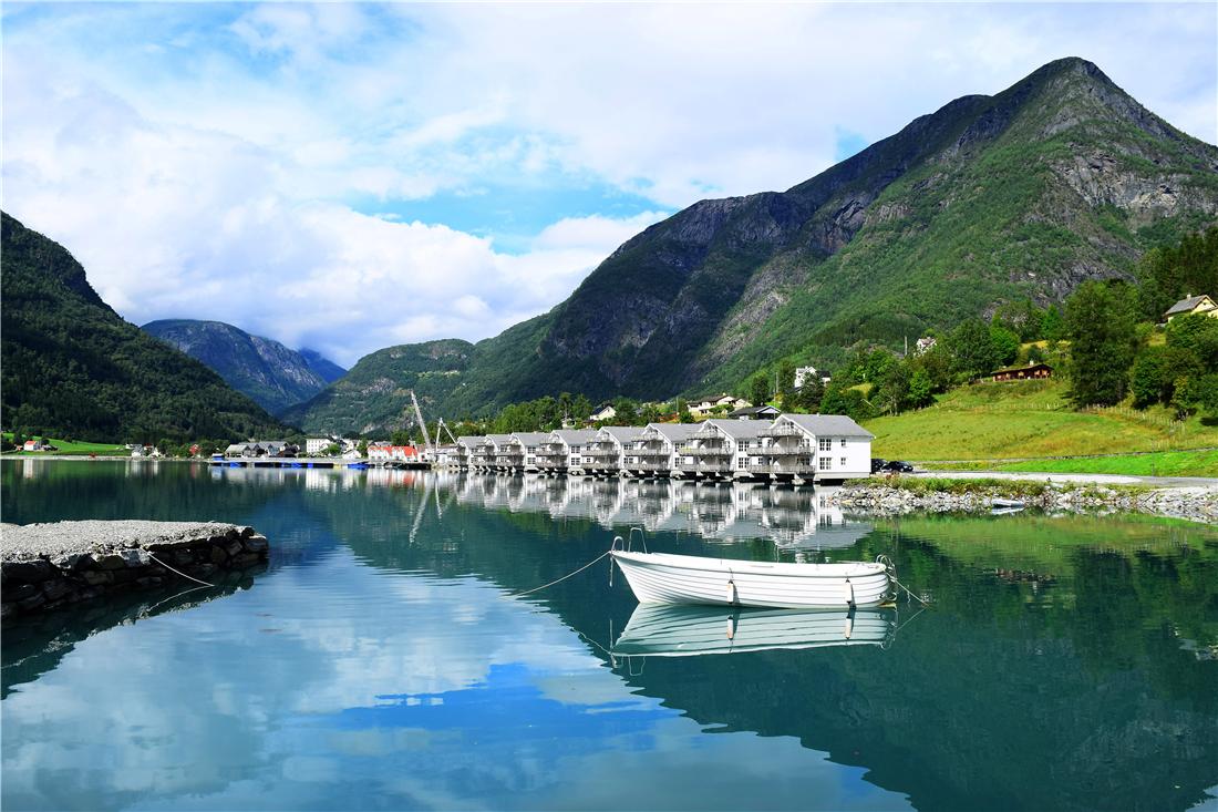 Im Hafen von Skjolden. In kurzer Entfernung finden Sie Restaurants und einen Supermarkt.