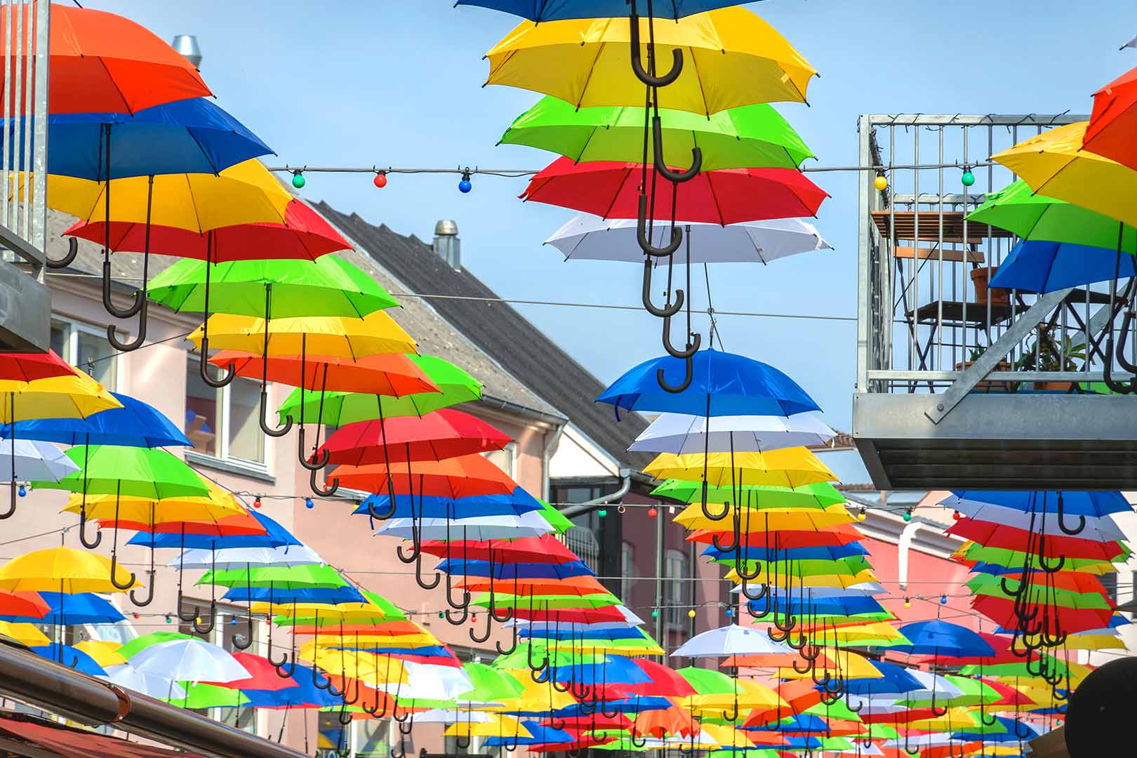 Von April bis Oktober schmücken bunte Sonnenschirme einen Teil der Fußgängerzone von Vejle und verwandeln die Gegend in eine stimmungsvolle Oase mit südeuropäischem Flair. Wenn Sie die Straße früh am Morgen besuchen, können Sie tolle Fotos machen!