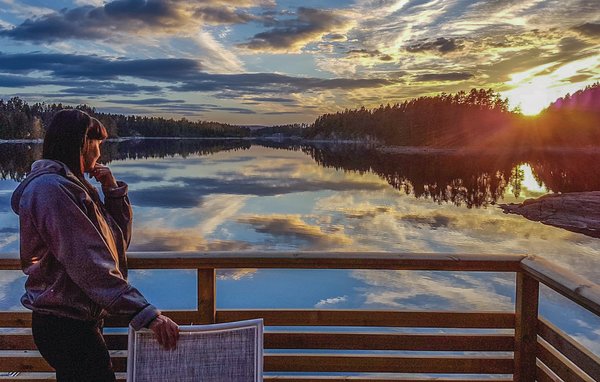 Es liegt in wunderbarer Umgebung, auf einem Strandgrundstück am Waldrand gelegen. Herrliche Aussicht von der Terrasse über den See Foxen vin - Stora Le nahe zur norwegischen Grenze im Värmland. Die Grillabende im Sonnenuntergang auf der wunderschönen Terrasse nimmt man hier gerne als schöne Erinnerungen mit nach Hause. Eine Tür von Wohnzimmer/ Küche führt auf die Terrasse. Letztere ist aber auch direkt von Schlafzimmer 1 zu erreichen, sodass man morgens direkt ins Freie gehen und den Sonnenaufgang genießen kann. Das Schlafzimmer 3 liegt im Dachspitz, was eine besonders heimelige Atmosphäre verschafft.
