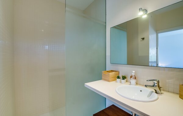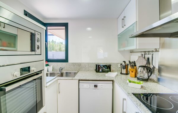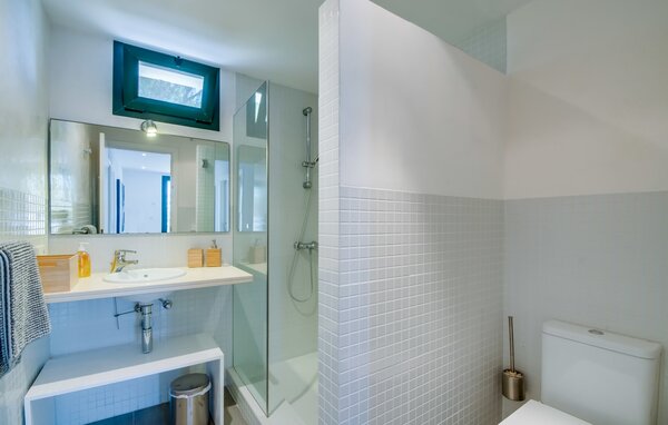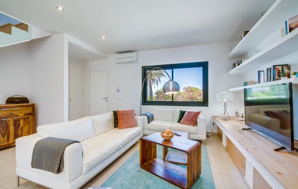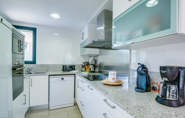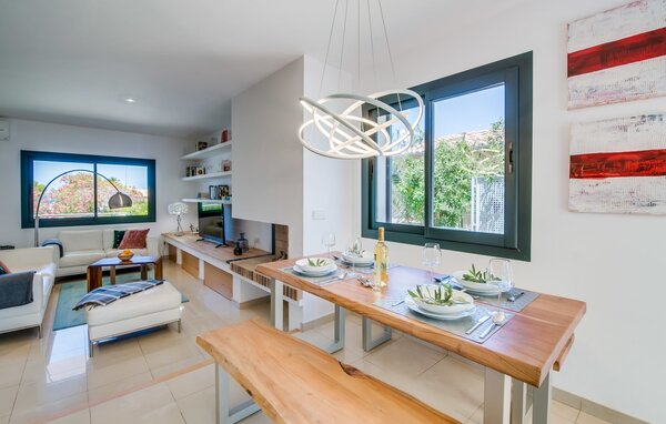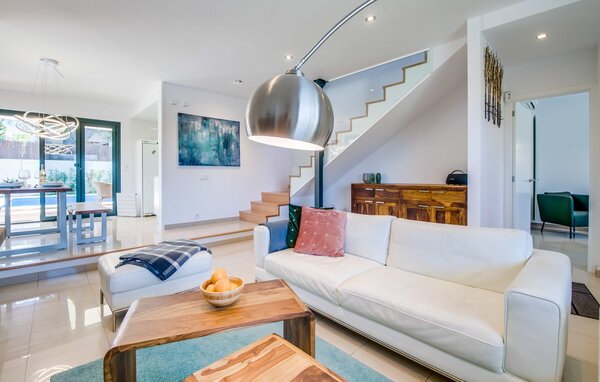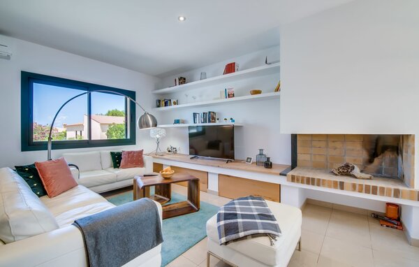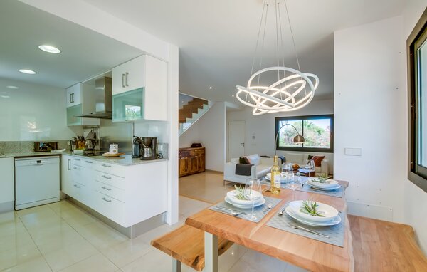 Im Inneren verbindet eine große Terrassentür den Poolbereich mit dem offenen Wohn- und Essbereich. Das helle, sommerliche Dekor besticht durch weiße Wände, warme Holzakzente und farbenfrohe Kunstwerke. Ein moderner Fernseher, ein offener Kamin und ein gemütliches Sofa schaffen eine einladende Atmosphäre für kühlere Abende. Die gut ausgestattete Küche bietet von der Mikrowelle bis zur Kaffeemaschine alles, was Sie für einen entspannten Urlaub benötigen. Mit vier Doppelzimmern und drei Bädern (zwei en suite) sorgt die Villa "Mediterra" für einen komfortablen Aufenthalt für alle.