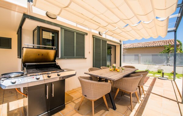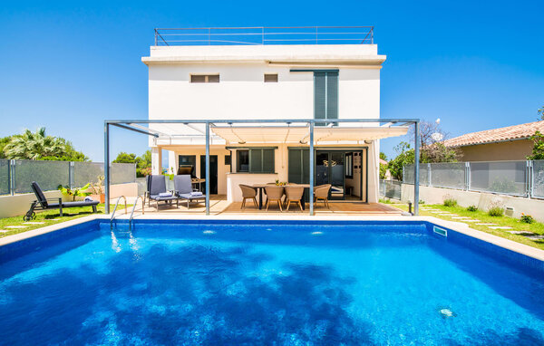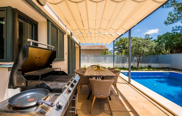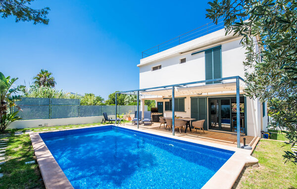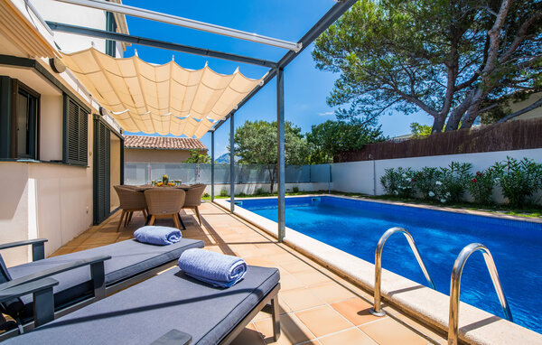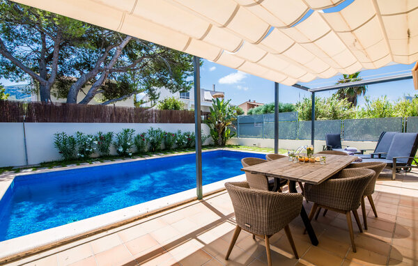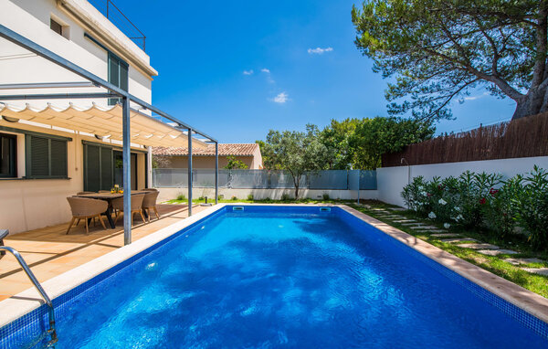 Für diejenigen, die sich entspannen möchten, führen nur wenige Schritte vom Haus entfernt auf die hintere Terrasse mit Pool, die sich perfekt für ein erfrischendes Bad eignet. Bequeme Liegen und ein moderner Gasgrill erwarten Sie, ideal für einen Nachmittag der Entspannung und des Essens im Freien. Genießen Sie Ihre Mahlzeiten am Holztisch mit Rattanstühlen und genießen Sie die ruhige Umgebung. Die Villa verfügt auch über eine Dachterrasse mit herrlichem Blick über die Bucht von Alcudia und die Berge.