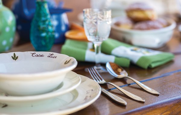 Zu den Schlafzimmern auf der 1. Etage geht vom Wohnzimmer im Erdgeschoss eine Innentreppe. Entlang der Außenfassade erstreckt sich eine Terrasse mit Grill, wo Sie ein Glas Wein genießen oder Spezialitäten vom Grill zubereiten können.