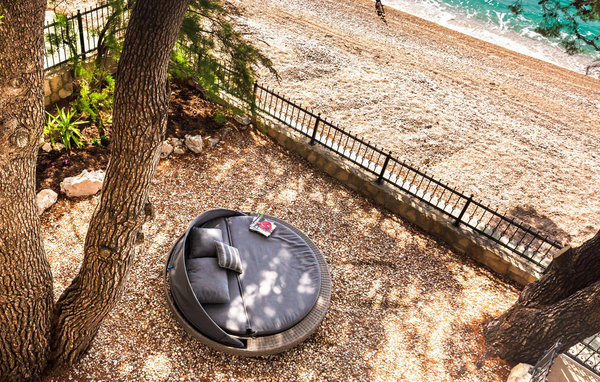 Gleich nach dem Aufstehen können Sie nach wenigen Schritten am Steinstrand ins kristallklare Meer tauchen. Im weitläufigen Garten vertiefen Sie sich auf den bequemen Lounge-Möbeln in Ihre Urlaubslektüre und gönnen Sie sich erholsame Siestas auf dem Daybed.