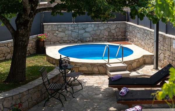 Auf eigenem umzäuntem Grundstück befindet sich ein Pool, Liegestühle, Grill, Außendusche und die Gäste genießen den natürlichen Schatten unter den Lindenbaum und der Weinrebe. Von der Außenseite ist der Eingang in die Wascherei mit Waschmaschine, Bügeleisen und -brett und einer Dusche/WC.