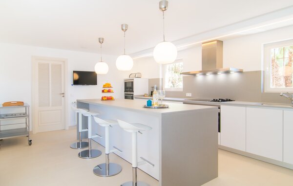Die Villa selbst besticht durch ihre hohen technischen Spezifikationen und ein minimalistisches Design in Kombination mit genau der richtigen Menge an Farben und Accessoires. Auch aus den lichtdurchfluteten Räumen können Sie die bereits erwähnte Aussicht genießen und gleichzeitig den architektonischen Luxus im Inneren der Immobilie genießen. Ein offenes Wohn-/Esszimmer verfügt über eine sehr gemütliche Sofaecke und einen hübschen Esstisch, an dem Sie drinnen gemeinsam eine deftige Mahlzeit genießen können. Ein weiterer Wohnraum mit Sofa und Sessel bietet Ihnen die Möglichkeit, sich hier in kleiner Gruppe oder alleine zurückzuziehen, zum Beispiel für einen Plausch oder eine ruhige Lektüre. Und einem gemütlichen Abend vor dem Kaminfeuer steht nichts mehr im Wege. In der hellen, voll ausgestatteten Küche finden Sie in einem durch und durch stilvollen Erscheinungsbild alles, was Sie für den täglichen Bedarf benötigen, darunter einen Wasserkocher, eine Filterkaffeemaschine und eine Kapselkaffeemaschine. Die Schlafzimmer bestechen durch klare Linien und viel Weiß, ergänzt durch dezente Farbtupfer, ohne überflüssig zu wirken. Der morgendliche Blick aus dem Fenster wird Tag für Tag ein besonderer Anblick sein. Eines der Doppelzimmer ist mit einem 2 x 2 m großen Bett ausgestattet, die anderen fünf sind alle mit zwei kombinierten Betten von 1,05 x 2 m ausgestattet. Geradlinigkeit und ein schlichtes, aber elegantes Design zeigen sich auch in den sechs Badezimmern, davon vier komfortable En-Suite-Badezimmer. Den Gästen stehen ein Bügeleisen und fünf Haartrockner zur Verfügung, sodass Sie keinen Gepäckraum verschwenden müssen, indem Sie Ihr eigenes Gepäck von zu Hause mitbringen.