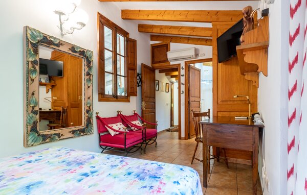 Das Grundstück ist groß und eine linke Seite des Gebäudes ist frei zugänglich, da der Rest geschlossen ist. Auf den Fotos sehen Sie das Innere des freigeschalteten Raumes. Im Inneren der Villa erwartet Sie ein sehr komfortabler Wohn-/Schlafraum, in dem Sie eine erholsame Nacht genauso genießen können wie hier in den Sesseln vor dem Flachbildfernseher mit Satellitenanschluss. Ein helles Bett in den Maßen 1,50 x 2,00 m prägt das wohnliche Ambiente, während weiße Wände, Holztüren und -fenster sowie eine sorgfältig ausgewählte Dekoration zu einem ebenso individuellen wie einladenden Charakter beitragen. In der rustikalen Küche finden Sie alles, was Sie für den täglichen Bedarf benötigen, zu deren Ausstattung selbstverständlich auch eine Filterkaffeemaschine gehört. Hier gibt es auch einen kleinen Essbereich im Innenbereich, der bei Bedarf genutzt werden kann. Das helle, im typisch mallorquinischen Stil gestaltete Badezimmer ist mit Toilette, Bidet, Waschbecken und Dusche ausgestattet. Zu Ihrer Bequemlichkeit stehen Ihnen im Haus Bügeleisen und Haartrockner zur Verfügung, sodass Sie sich keine Sorgen machen müssen, Ihre eigenen von zu Hause mitzubringen.