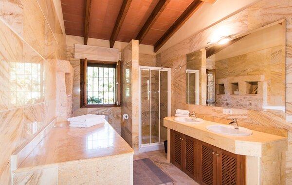 Zwei Schlafzimmer im Erdgeschoss sind über ein Badezimmer miteinander verbunden und teilen sich dieses. Das Badezimmer ist mit einer Dusche und zwei Waschbecken ausgestattet. Das hintere Schlafzimmer bietet einen direkten Zugang zum Garten (siehe Grundriss Finca).