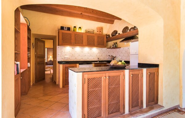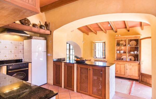 Die Küche verfügt über eine Theke, die zum verglasten Esszimmer/Wintergarten hin geöffnet ist. Der lichtdurchflutete Wintergarten der Finca bietet einen idealen Rückzugsort für entspannte Stunden. Umgeben von großen Fenstern, die den Blick in den mediterranen Garten freigeben, ist dieser Raum perfekt, um die Ruhe der Umgebung zu genießen - sei es mit einem Buch, bei einer Tasse Kaffee oder einem Glas Wein. Bitte beachten Sie, dass die Fenster im Wintergarten nicht zu öffnen sind.