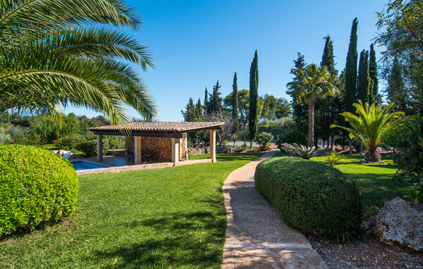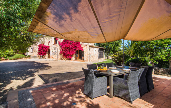 Der weitläufige Außenbereich der Finca lädt zum Entspannen und Genießen ein. Der Garten ist mit mediterranen Pflanzen wie Palmen und Bougainvillen bepflanzt und bietet zahlreiche Sitz- und Liegeplätze.
