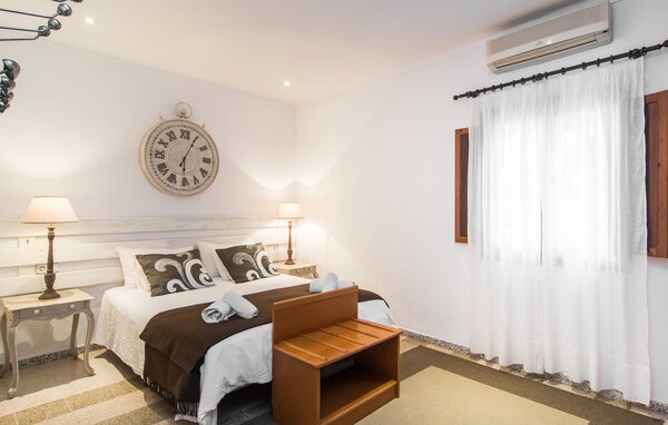 Im Inneren ist "Can Tiró" mit einer sorgfältig kuratierten Mischung aus traditionellen und modernen Elementen ebenso einladend. Dunkles Holz ergänzt strahlend weiße Wände und Fliesenböden werden mit charmanten Wohnaccessoires kombiniert. Alle Zimmer befinden sich auf einer Ebene. Der offene Wohn- und Essbereich ermöglicht es Ihnen, sich auf dem bequemen Sofa zu entspannen, während Sie den Fernseher genießen, wobei ein wunderschön geschnitzter Holzbogen zum Essbereich führt. Die kleine, aber voll ausgestattete Küche bietet zusätzliche Sitzgelegenheiten an der schicken Theke, perfekt für ein schnelles Frühstück oder ein Glas Wein beim Kochen. Zwei Schlafzimmer und ein Bad en Suite vervollständigen den Wohnraum.