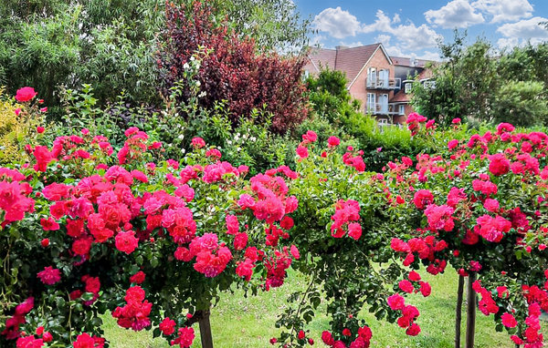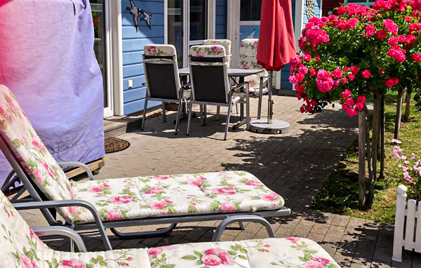 Im Sommer lockt natürlich die großzügige Terrasse. Der Blick auf den liebevoll angelegten Garten lässt sich am besten vom Strandkorb aus genießen, der Platz für bis zu drei Personen bietet.
