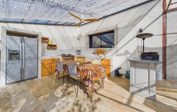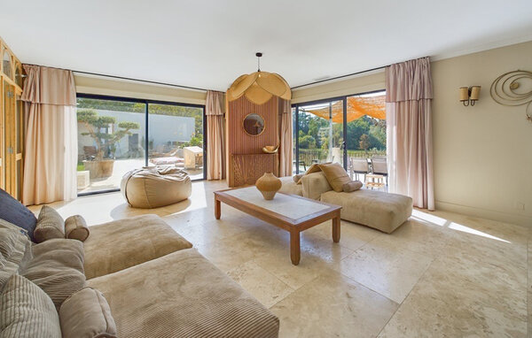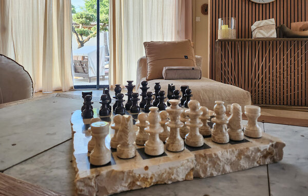 Erleben Sie einen erholsamen Aufenthalt in diesem modernen Ferienhaus, das durch seine harmonische Gestaltung und die idyllische Umgebung überzeugt. Die großzügige Ausstattung, kombiniert mit der warmen, mediterranen Atmosphäre, schafft den idealen Rahmen für eine unvergessliche Auszeit. Der offene Wohnbereich besticht durch seine helle, einladende Einrichtung. Machen Sie es sich auf den gemütlichen Sofas bequem oder genießen Sie an kühlen Tagen die wohlige Wärme des Kaminofens. Speisen Sie gemeinsam an einem der stilvollen Esstische, entweder im Innenbereich oder auf der sonnigen Terrasse, und genießen Sie Ihre freie Urlaubszeit.