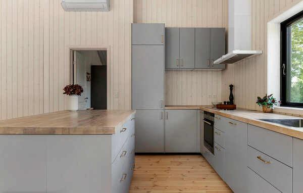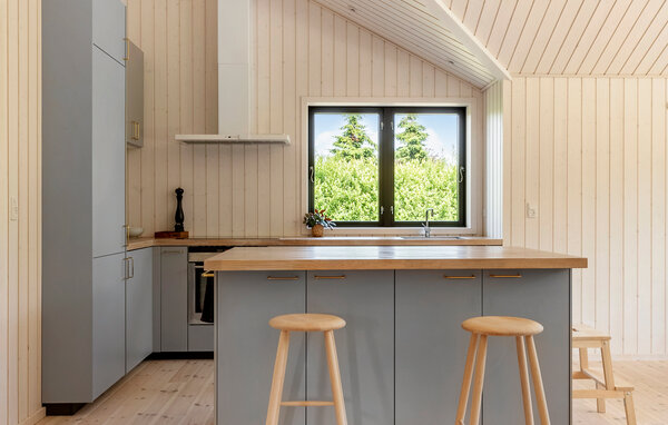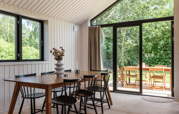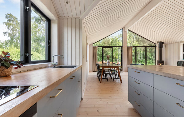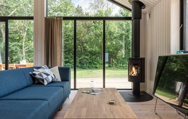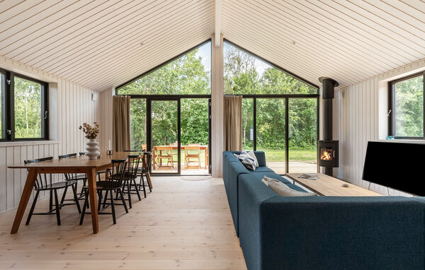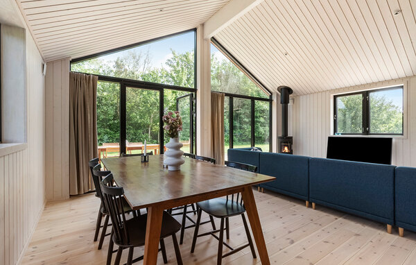 Ihr Ferienhaus bietet Ihnen den idealen Rahmen für eine erholsame Zeit in Küstennähe. Die ruhige Umgebung und das stilvolle Ambiente schaffen eine angenehme Atmosphäre für Familien, die Natur und Komfort gleichermaßen schätzen. Der großzügige Wohnraum mit hohen Decken und Panoramafenstern öffnet sich zur Terrasse und bietet einen freien Blick ins Grüne. Entspannen Sie auf dem großen Sofa oder lesen Sie ein Buch am Kaminofen. Der kombinierte Ess- und Wohnbereich lädt zu geselligen Abenden ein. In der offenen Küche mit Kücheninsel und moderner Ausstattung bereiten Sie gemeinsam Ihre Lieblingsgerichte zu und genießen den Blick durch die großen Fenster ins Grüne.