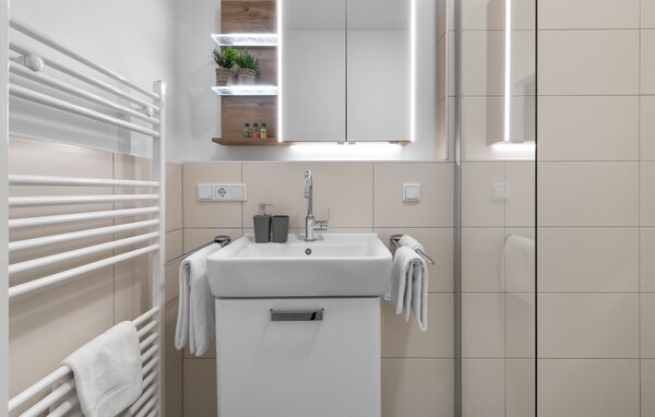 Das moderne Badezimmer präsentiert sich mit einer bodengleichen Dusche und einem luxuriösen Ambiente. Die hochwertige Ausstattung setzt sich durch die gesamte Wohnung fort und sorgt für ein gehobenes Wohngefühl.