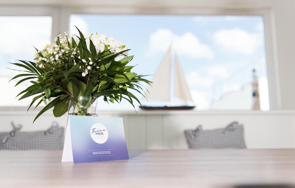 Das schwimmende Haus erstreckt sich über drei Ebenen. Im Obergeschoss befindet sich der offen gestaltete Wohn- und Essbereich mit Rundum-Wasserblick, voll ausgestatteter Wohnküche und angrenzender Terrasse. Von hier aus gelangt man auf die spektakuläre Dachterrasse mit Blick über den Segel- und Sportboothafen, die Schlei und deren Mündung in die Ostsee. Ausgestattet mit hochwertigen Gartenmöbeln und Weber Elektrogrill bieten die Terrassen pures Urlaubsfeeling und atemberaubende Sonnenuntergänge.