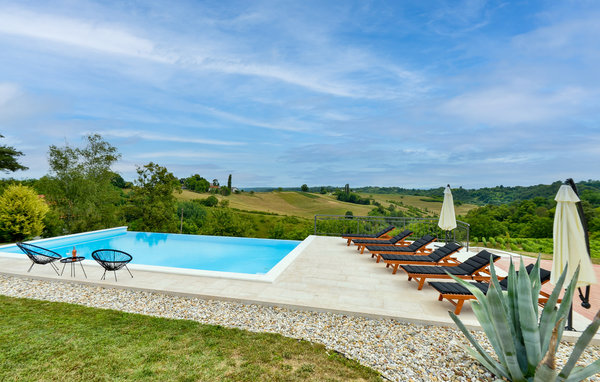 Attraktives Ferienhaus mit Pool und Panoramablick auf die Landschaft.