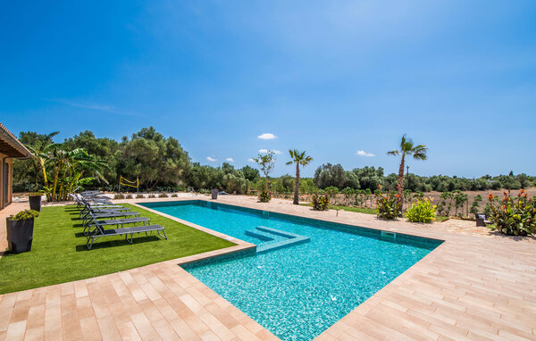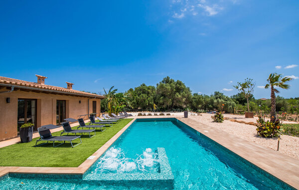 Traditioneller Außenbereich und modernes Interieur. So empfängt die Villa „Can Paz“ ihre Besucher nach der 15-minütigen Fahrt vom Flughafen. Von außen präsentiert das zweiteilige Gebäude den klassischen Look einer mallorquinischen Natursteinvilla. Das Herzstück des Außenbereichs – der schöne und sehr gepflegte Garten mit angrenzender Poolterrasse – liegt auf der Südseite des Hauses. Ein toller Ort, um den Alltag zu Hause zu vergessen und gemeinsam eine entspannte Zeit im Freien zu verbringen. Hier können Sie erholsame Tage genießen, auf einer der vielen vorhandenen Liegen dösen, sich am großen Esstisch unter der überdachten Terrasse einen frischen Salat gönnen oder sich unter dem großzügigen Sonnenschirm in einen der hübschen Rattansessel mit bequemen Sesseln setzen Kissen und vertiefen Sie sich in ein gutes Urlaubsbuch. Der Pool verfügt über beachtliche Ausmaße: Gäste jeden Alters werden die 20 x 3,5 m große Erfrischung zu schätzen wissen.
