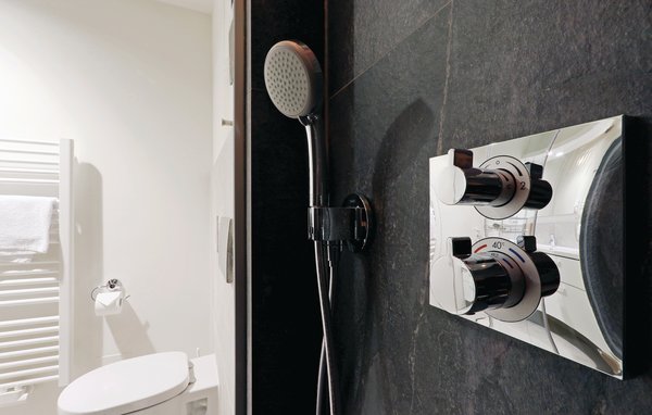 Das Badezimmer präsentiert sich als Ihr persönlicher Wellness-Bereich. Hier können Sie sich nach einem langen Spaziergang an der Ostsee in der Sauna aufwärmen. Außerdem verfügt das Badezimmer über ein Dampfbad mit Regendusche.