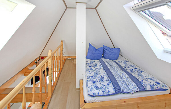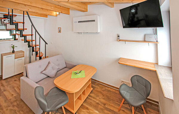 Diese Wohnung befindet sich im ersten Stock. Sie verfügt über einen Wohnbereich (Polstermöbel, Schreibtisch, Smart-TV), einen offenen Schlafbereich im Dachgeschoss mit Doppelbett und TV (Zugang über eine steile, platzsparende Treppe), eine offene Küchenzeile (Elektroherd, Kühlschrank, Essecke, diverse Küchengeräte) und ein Badezimmer mit Dusche/WC. Außerdem gibt es eine moderne Klimaanlage, automatische Fenster, kostenfreies WLAN und einen internetfähigen Smart-TV.