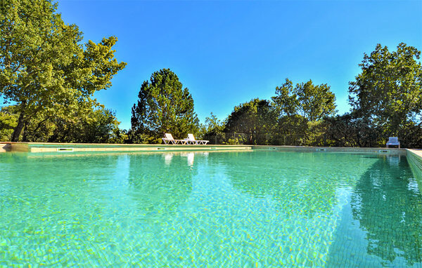 Genießen Sie den Urlaub nahe der Natur in diesem Ferienhaus mit Poolzugang.