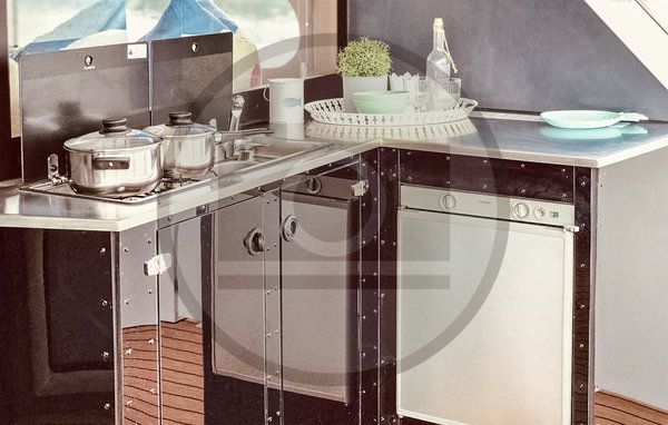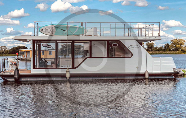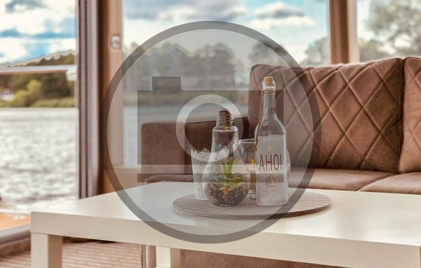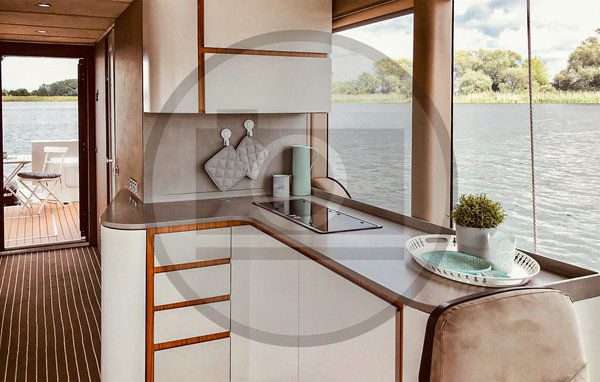 Das Hausboot ist vollständig ausgestattet WC (elektr. Häcksler-Toilette), Waschbecken, separater Dusche, Küchenzeile mit Spüle, zwei Gaskochfeldern und Kühlschrank, Sitzgruppe, Einbauschrank und einem Fernseher. Dank der Rundumverglasung können Sie von überall im Hausboot aus umwerfende Blicke auf das Wasser und die Landschaft genießen! Die besonderen Highlights des Hausboots erwarten Sie im Außenbereich: die Heckterrasse ist mit einer modernen Außenküche mit Kühlschrank, Kochfeldern und Spüle ausgestattet, sodass Sie hier bei gutem Wetter an der frischen Luft kochen und essen können. Vom Heck des Hausboots aus führt eine Außentreppe auf das Dach, wo sich eine herrliche Dachterrasse über den kompletten Wohnbereich erstreckt.