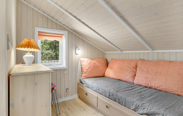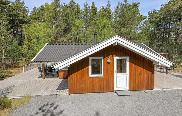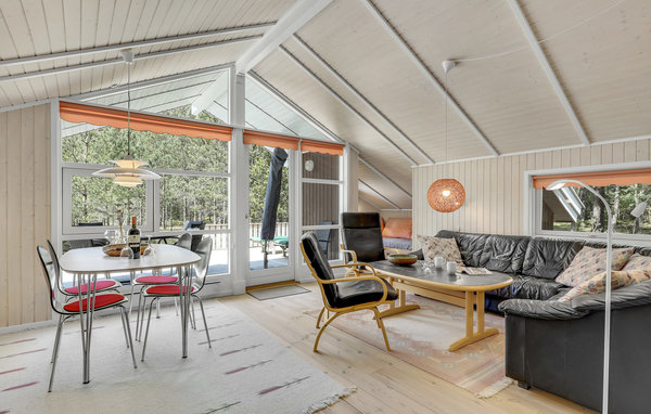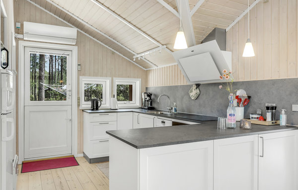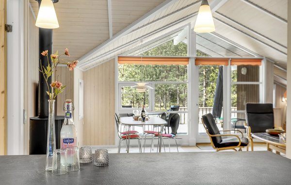 Einladendes und gepflegtes Ferienhaus mit moderner, offener Küche und gelegen nicht weit vom schönen Sandstrand, einer herrlichen Natur und dem Dueodde Golfplatz. Überall ist das Ferienhaus behaglich, die hellen Holzverkleidungen an den Wänden die schrägen Decken verleihen dem Inneren eine schöne Atmosphäre. Abends können Sie sich in gemütliche Sofas und Lehnstühle zurückziehen. Für ein Mittagsschläfchen gibt es einen Alkoven. Auf der Terrasse steht ein Grill. Im gut ausgestatteten Haus genießen Sie das Internet gratis. Beheizt wird es mit einer Wärmepumpe und einen Kaminofen, damit es auch richtig gemütlich ist. In der Nachbarschaft liegen große Naturgrundstücke, gute Wanderwege und einladende Joggingstrecken. Schön nahe ist der Strand zu finden. Das Haus ist ideal für einen Urlaub in jeder Jahreszeit.