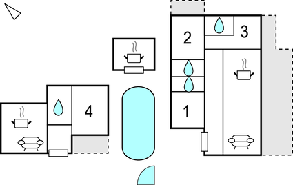 Die Wohnbereiche liegen im Erdgeschoss von zwei Häusern, dazwischen ist der Pool eingerichtet. Auf dem geräumigen Grundstück gibt es noch einen Anbau, der den Grill, einen großen Tisch und Stühle beherbergt. Vorhanden sind ebenfalls Kinderspielgeräte wie Schaukel, Spielhaus, Rutsche, Sandkasten sowie Möglichkeiten für Aktivitäten im Freien wie Trampolin, Volleyballnetz, Badminton und Tischtennis.