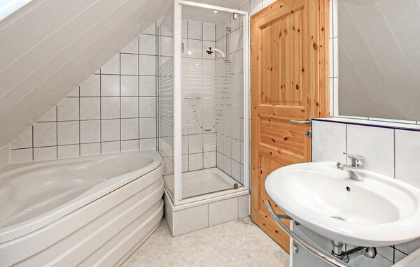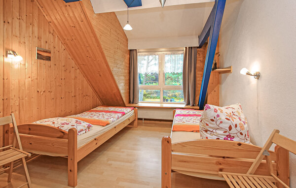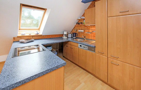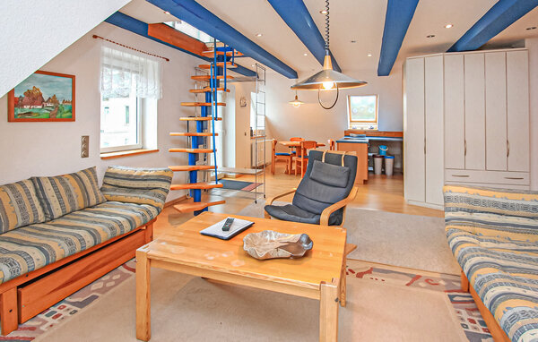 Die 75 qm große Ferienwohnung für 4 Personen ist ausgestattet mit einem Wohnbereich (Polstermöbel, Flachbild-TV), einer offenen Küchenzeile (E-Herd mit Backofen, Kühlschrank mit Tiefkühlteil, Spülmaschine, div. Küchengeräte), einem Schlafraum mit 2 Einzelbetten und einem Bad mit Badewanne und Dusche. Im Dachgeschoss (Zugang über steile Raumspartreppe) befindet sich ein weiterer Schlafraum (Doppelbett) und ein zusätzliches WC.