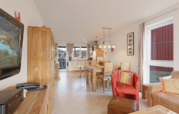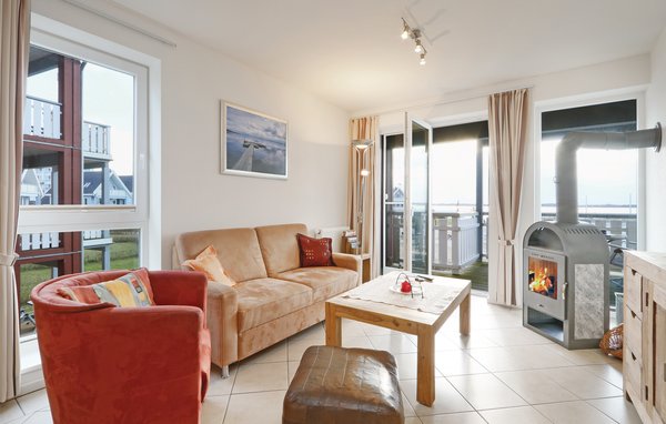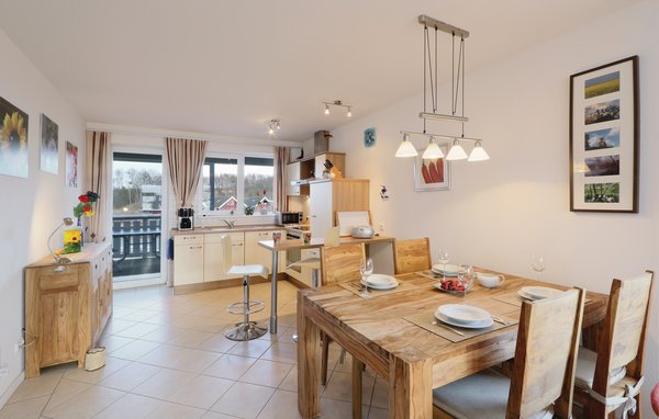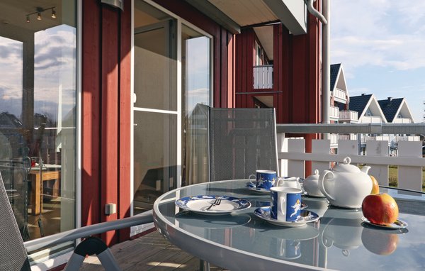 Das separate Schlafzimmer ist mit einem Doppelbett und hellen Kiefernmöbeln ausgestattet. Von hier aus haben Sie einen eigenen Balkonzugang mit Müritzblick. Ein weiterer Schlafplatz befindet sich auf dem Sofa im Wohnzimmer, das zu einem 140 cm breiten Schlafsofa ausgezogen werden kann.