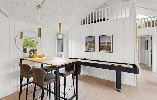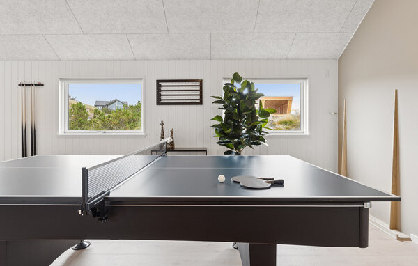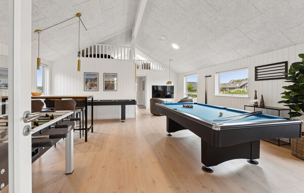 Der helle Wohnbereich besticht durch hohe Decken und große Panoramafenster. Machen Sie es sich auf den bequemen Sofas gemütlich oder genießen Sie gemeinsame Mahlzeiten am langen Esstisch mit Platz für alle Urlaubsgäste. Kochen Sie in der modernen Küche mit großzügiger Kochinsel, hochwertigen Geräten und viel Stauraum. Nutzen Sie den Aktivitätsraum mit Billard, Tischfußball und Shuffleboard für gesellige Abende. Die Poolabteilung mit Rutsche, Volleyballnetz und Gegenstromanlage sorgt für Badespaß, während die Sauna zusätzliche Erholung bietet.