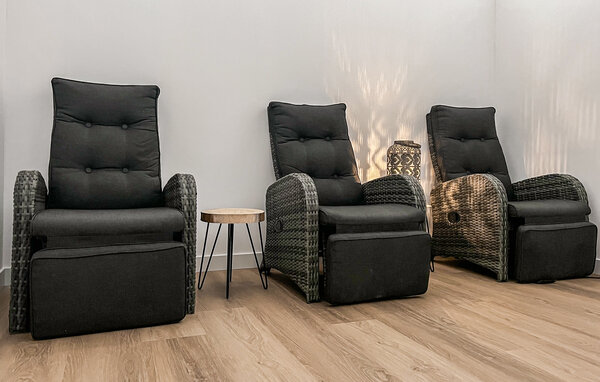 Genießen Sie im Garten des Ferienhauses in vollen Zügen die Sonne und die pure Urlaubsentspannung. Erfrischen Sie sich im gemeinsam genutzten Pool und lassen Sie den Tag mit Getränken im Freien ausklingen.