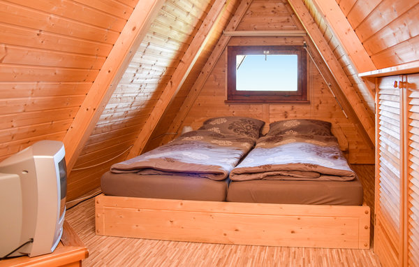 Über eine steile, offene Holztreppe erreichen Sie im Spitzdach den Schlafbereich, der nochmals über einen kleinen TV verfügt.