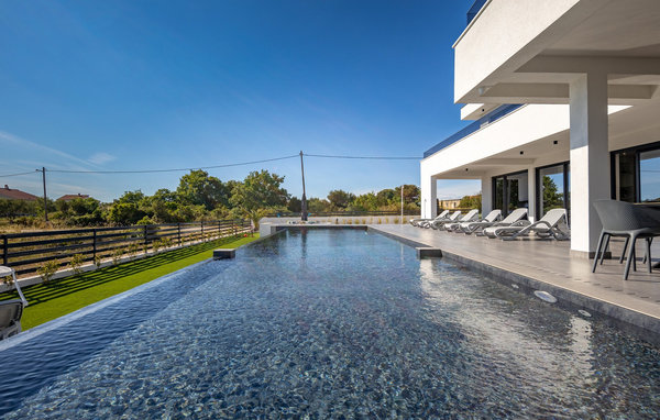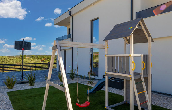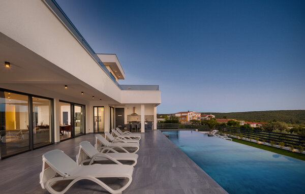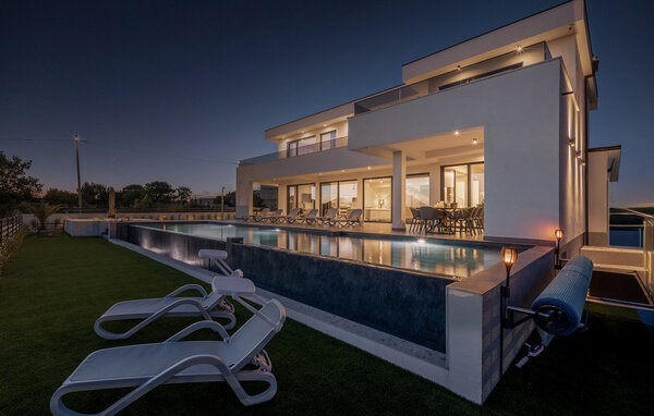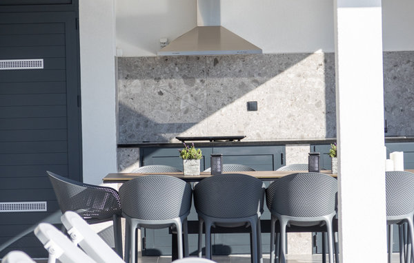 Der elegante Außenbereich ist wie geschaffen, um das herrliche Klima Kroatiens zu jeder Tageszeit zu genießen. Ziehen Sie morgens gemächlich Ihre Bahnen im großen, abends stimmungsvoll beleuchteten Pool mit integriertem Flachbereich, lassen Sie die friedliche Atmosphäre bei einem Frühstück auf der Terrasse auf sich wirken und entspannen Sie auf der Sonnenliege, während sich die Kleinen an den reizvollen Spielmöglichkeiten erfreuen. Gönnen Sie sich bei Sonnenuntergang einen Drink auf der großen Dachterrasse mit Panoramablick bis zum Meer und bereiten Sie in der Sommerküche köstliche Beilagen für Ihre Grillabende zu.