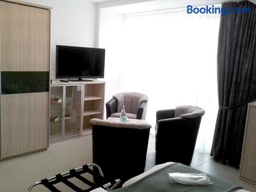 Guest rooms are equipped with a flat-screen TV with satellite channels, a coffee machine, a bath or shower, slippers and a wardrobe. At the hotel each room is equipped with bed linen and towels.