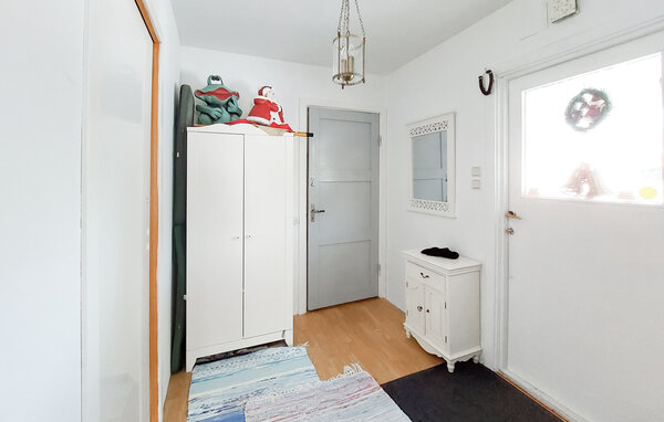 Ihr charmantes Ferienhaus in Vittsjö, umgeben von einem weitläufigen Garten, bietet eine schöne Mischung aus Komfort und Natur. Genießen Sie Ihre Morgenstunden im lichtdurchfluteten Wintergarten, wo bequeme Sitzgelegenheiten und ein Esstisch Platz für entspannte Mahlzeiten oder gemütliche Lesestunden bieten. Freuen Sie sich über die warmen Sonnenstrahlen, die durch die großen Fenster hereinströmen, und genießen Sie die Aussicht auf die grüne Umgebung. Auch das großzügige Wohnzimmer ist ein Ort der Entspannung. Machen Sie es sich auf dem großen Sofa gemütlich und genießen Sie die Wärme des Kamins, der an kühlen Abenden eine behagliche Atmosphäre schafft. Ein rustikaler Kronleuchter verleiht dem Raum zudem eine elegante Note. In der gut ausgestatteten Essküche können Sie regionale Spezialitäten zubereiten. Genießen Sie Ihre Mahlzeiten im integrierten Essbereich, der einen charmanten, skandinavischen Charakter ausstrahlt.