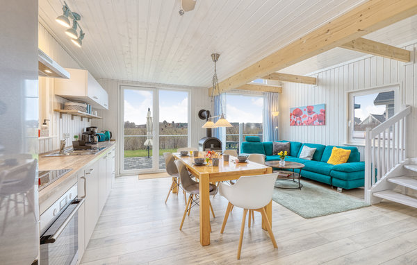 Das Ferienhaus verfügt über eine moderne Einbauküche mit angrenzendem Ess- und Wohnbereich. Dieser lädt zu einem gemütlichen Abendessen mit der ganzen Familie ein. Auf der Galerie im ersten Obergeschoss können Sie durch die bodentiefen Fenster einen einzigartigen Blick über das Grundstück genießen. Das Ferienhaus verfügt über zwei separate, helle Schlafzimmer, von denen eines mit zwei Doppelbetten ausgestattet ist. Ein zusätzlicher Schlafplatz kann im Wohnzimmer auf dem Schlafsofa eingerichtet werden. Das Duschbad mit Tageslicht und hochwertiger Wellnessdusche rundet Ihren gelungenen Urlaubstag ab. Für extra Komfort an warmen Tagen gibt es zwei Ventilatoren.